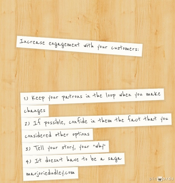 Keep your patrons in the loop when you make changes—even if said changes seem insignificant. Your best customers may offers insights or other alternatives that weren’t considered. You may find they support you even more.