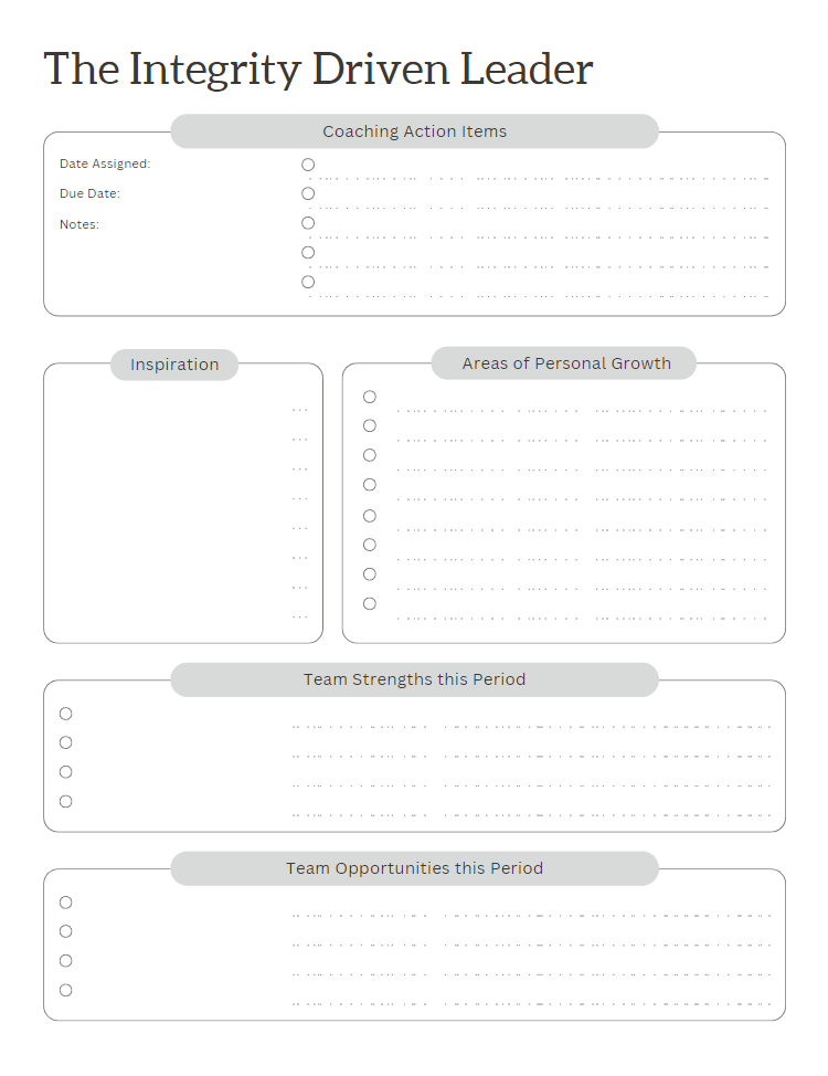✏️ Do you journal? Or are you interested in starting but not quite sure how, or where, or what to even write about? Reply to this email and I will send you a free copy of the Integrity Driven Leader journal which is designed to help you focus on your big vision as well as your development as a leader and developing your team. See a couple sample pages below: