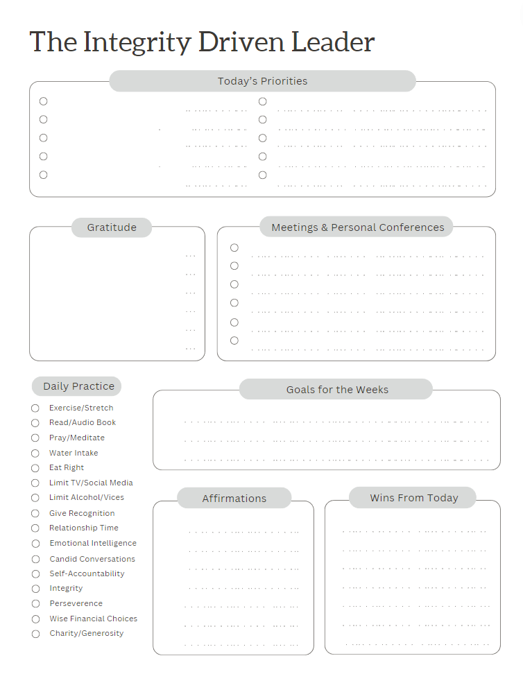 βοΈ Do you journal? Or are you interested in starting but not quite sure how, or where, or what to even write about? Reply to this email and I will send you a free copy of the Integrity Driven Leader journal which is designed to help you focus on your big vision as well as your development as a leader and developing your team. See a couple sample pages below: